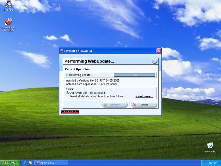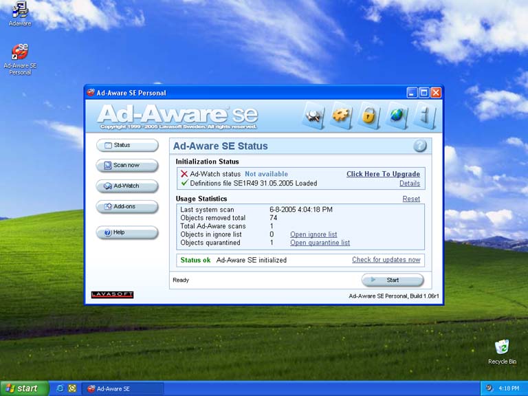 Once complete, you will be back at the start-up screen for Ad-aware. To make sure all sypware has been removed run it again by choosing Start. It is also very important that every time you run Ad-aware that you check for any updates by clicking the "Check for updates" link on this screen. This will keep the list of spyware that Ad-aware searches for up to date. You will have to be connected to the Internet to check for updates, but once updates have been downloaded and installed and the scan has began you can disconnect from the Internet.