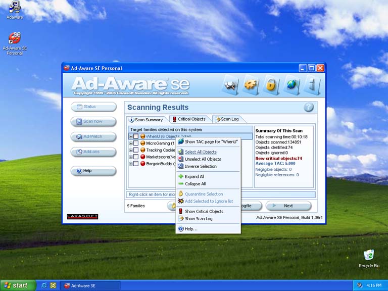 After the scan is complete the Scanning Results will be displayed. Under the Scan Summary tab, right-click and choose "Select All Objects". This will setup all spyware found on your system to be removed. Then choose Next.